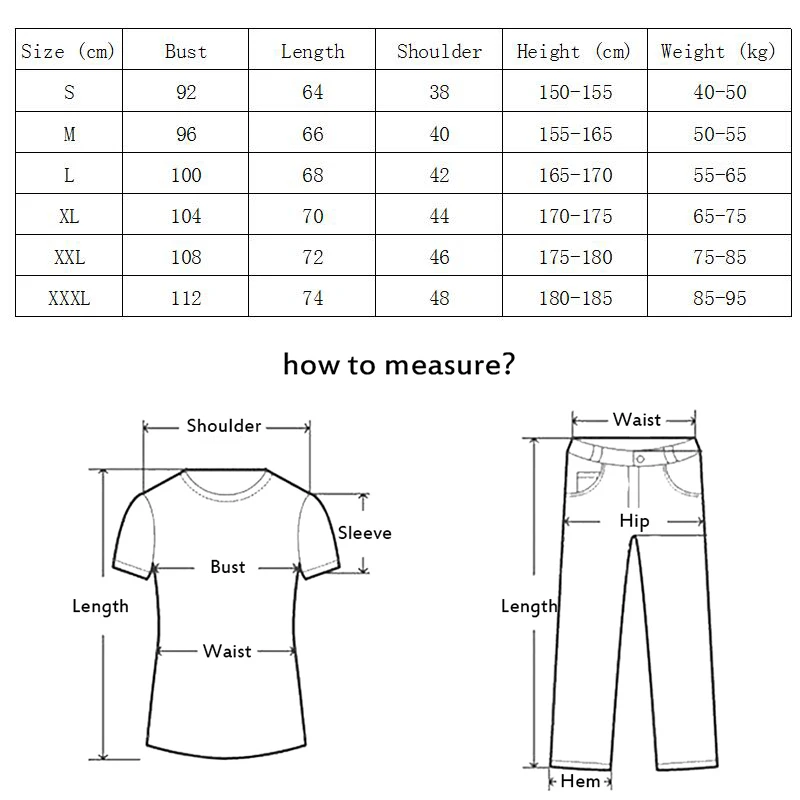 XXXL = buste 112 cm, ??paule 48 cm, longueur 74 cm, pour poids 85-95 kg, hauteur 180-185 cm ;