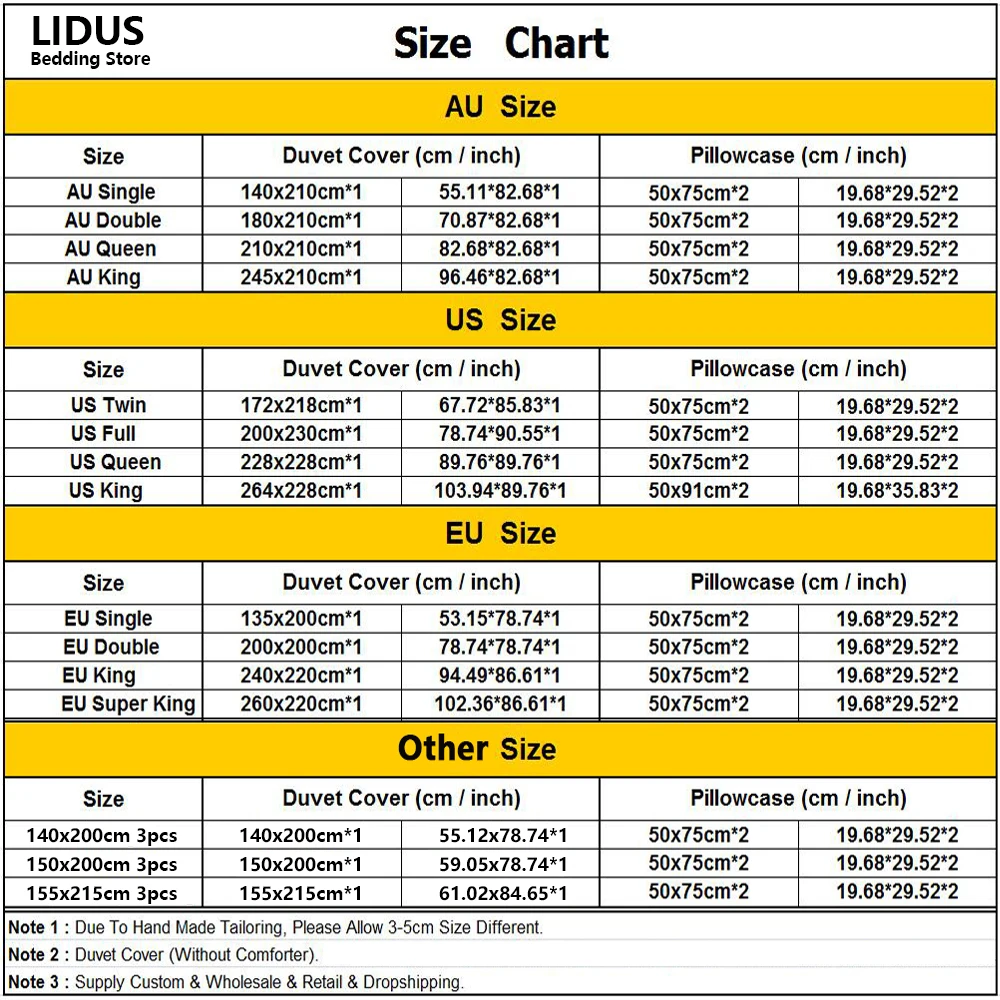 AU Single(140x210cm) ,AU Double(180x210cm) ,AU Queen(210x210cm) ,AU King(245x210cm) ,US Twin(172x218cm) ,US Full(200x230cm) ,US Queen(228x228cm ,US King(264x228cm) ,EU single(135x200cm) ,EU Double(200x200cm) ,EU King(240x220cm) ,EU SK(260x220cm) ,140x200cm 3pcs ,150x200cm 3pcs ,155x215cm 3pcs |
